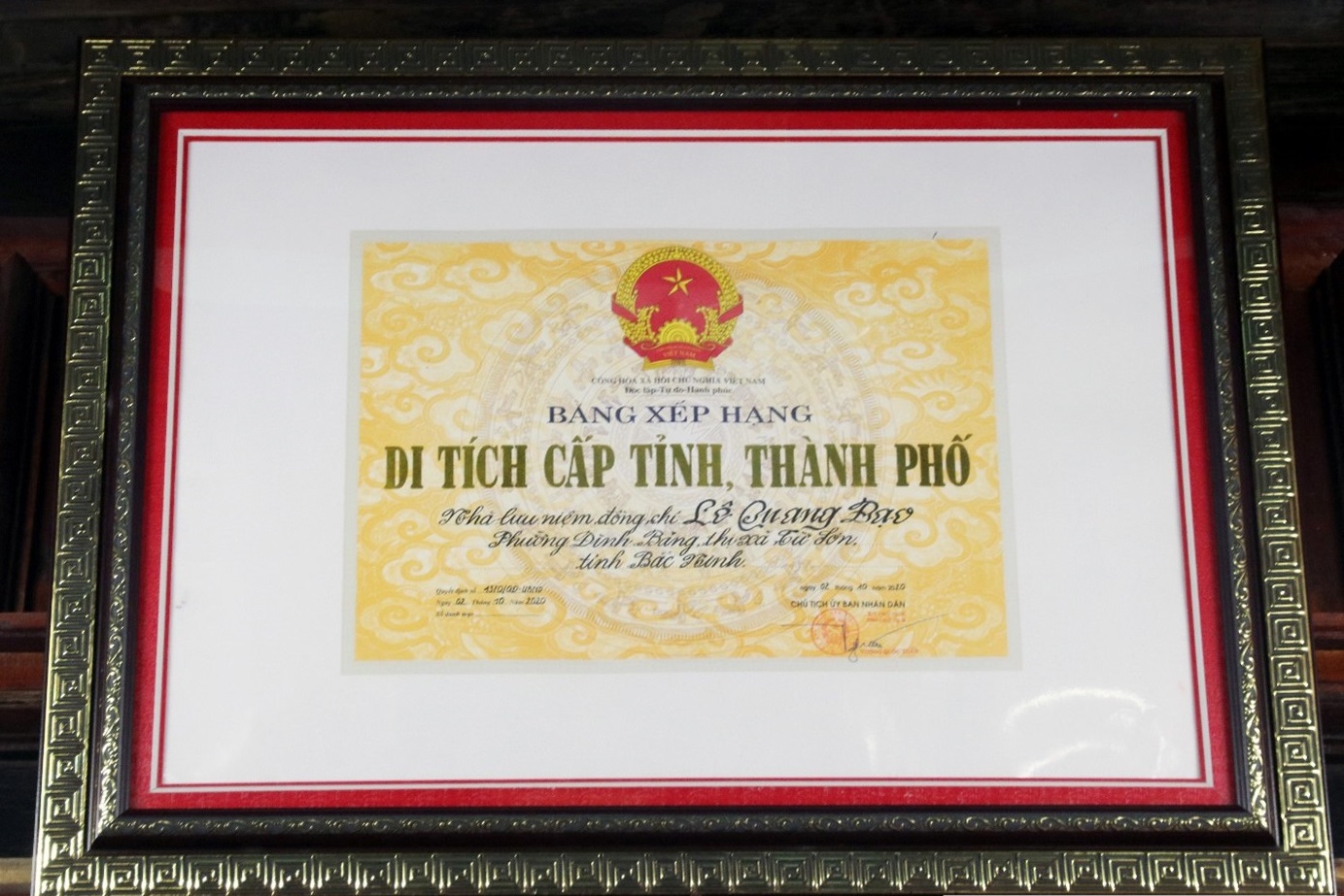 Bằng công nhận gia đình có công với nước của gia đình đồng chí Lê Quang Đạo.